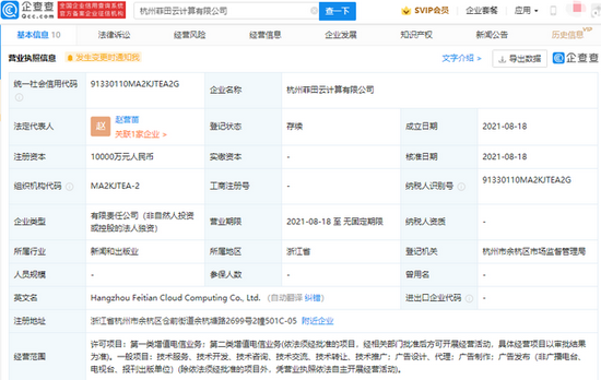 企查查APP显示,8月18日,杭州菲田云计算有限公司成立,法定代表人为赵营苗,注册资本1亿元人民币,经营范围包含:第一类增值电信业务;第二类增值电信业务;广告制作等。