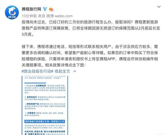 2月18日消息,携程官方微博发文称,更新旅游度假产品特殊退订保障政策,已将全球跟团游无损退订的保障范围从2月底延长至3月底。