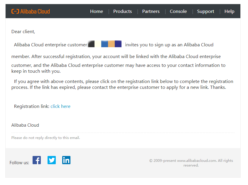 1、联系阿里云国际站渠道分销商快速云:www.ksuyun.com(已经工单确认过是正规授权的分销商)给您发账号注册邀请邮件: