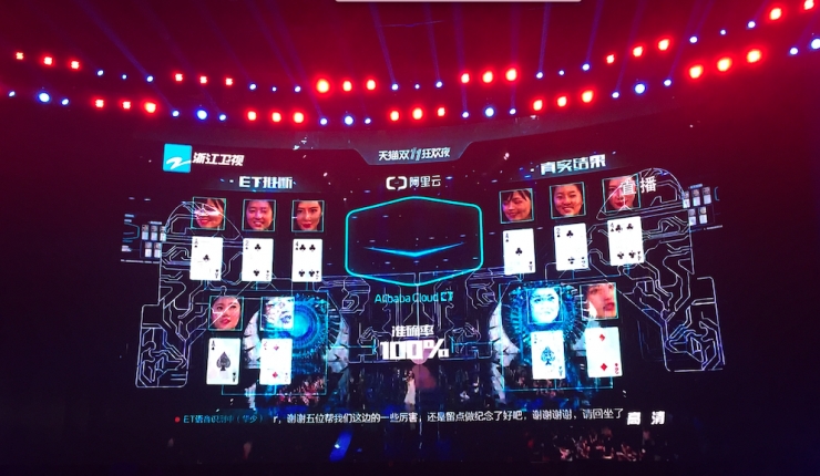 “双11”晚会现场,ET先是扫描现场5名观众的面部。然后,主持人让观众依次随机切牌,拿到黑色牌的观众转身面向后方。其中有4名观众转身后,ET再次进行扫描。最后ET 得出每位观众手拿的牌。